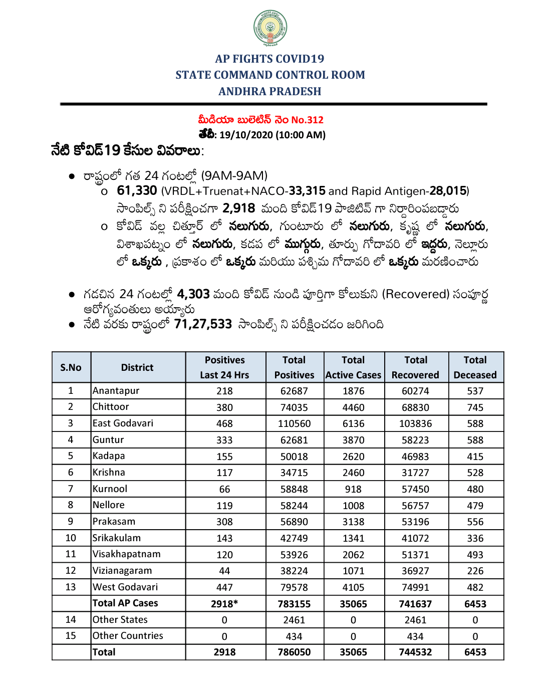 On the 19th of October, Andhra Pradesh reported 2,918 cases of the Novel Coronavirus or COVID-19.