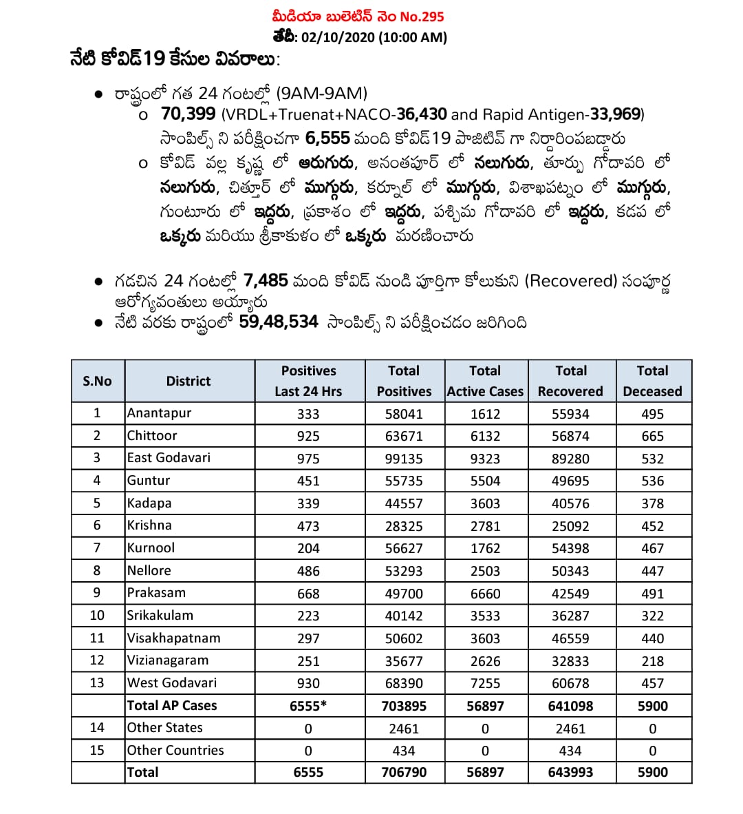 The Andhra Pradesh Health Department on the 2nd of October,  reported as many as 6,555 New new  Novel Coronavirus or COVID-19 cases