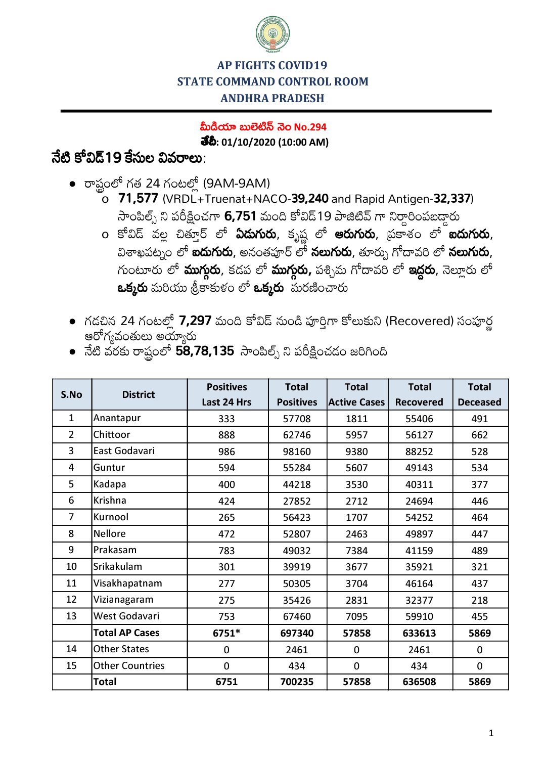 Andhra Pradesh, on the 1st of October, reported 6,751 new cases of the Novel Coronavirus or COVID-19.