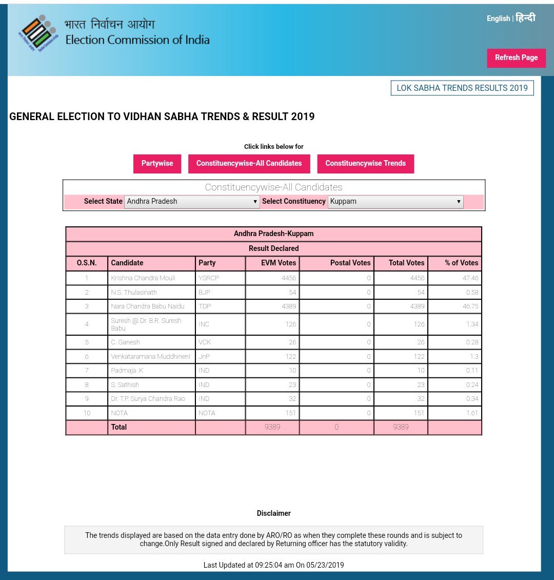 9: 34 A.M. – After 2 rounds of counting completed, the YSRCP is leading with 46.2 % votes, which is 72 seats and TDP with 40.1 % votes, which is 17 seats in Andhra Pradesh Assembly elections.