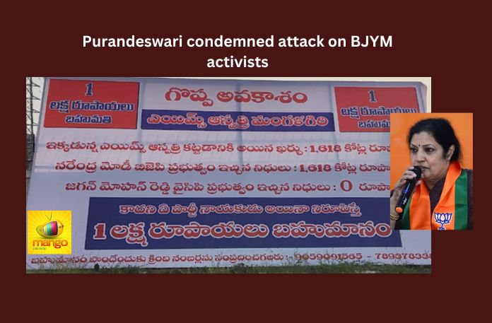 Amaravati: AP Bharatiya Janata Party (BJP) president Daggubati Purandeswari condemned the attack against Bharatiya Janata Yuva Morcha (BJYM) activists who erected flex banners at All India Institute of Medical Sciences (AIIMS) Mangalagiri campus. Local circle inspector allegedly attacked the activists of BJYM over erecting anti-government flex banners.