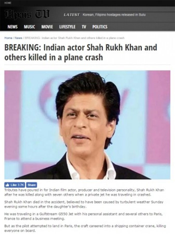 The European Press in the last week published a report that the king of Bollywood Shah Rukh Khan had died in a Plane Crash. The death hoax spread like wildfire and came to the King’s notice.