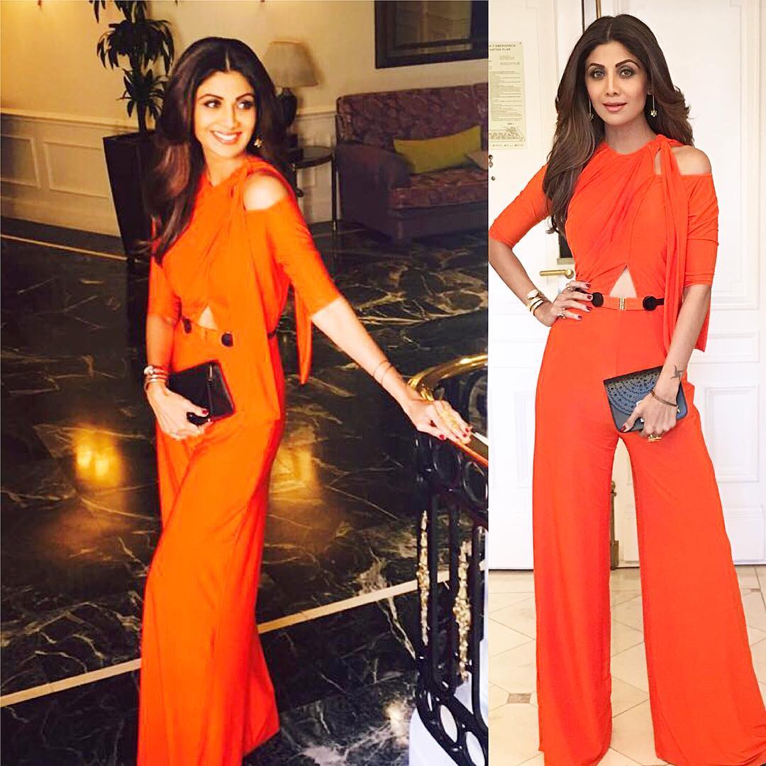 The yummy mommy Shilpa Shetty stole the show at a conference in an orange jumpsuit. Her waivy hair and simple make up rounded off her look. The star looked resplendent in the vibrant colour dress.