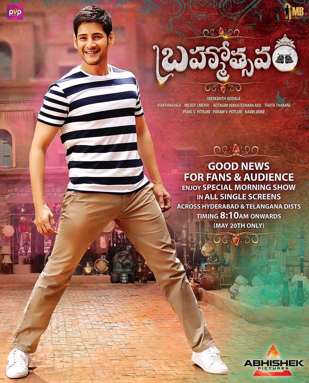 Hyderabad: Here comes the brand new poster of Mahesh Babu from “Brahmotsavam” and also a great news for his fanatic fans. On Monday, the movie makers unveiled a new poster and announced that a special morning show will be organised in all single screens across Hyderabad and Telangana districts from 8:10 am onwards only on May 20.