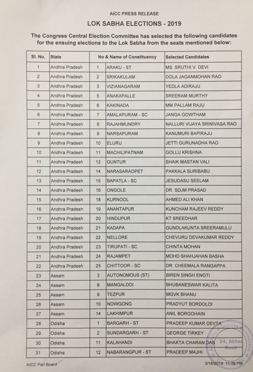 The list was declared on the night of the 18th of March, after the INC chief, Rahul Gandhi, held a meeting with the Congress Central Election Committee (CCEC.)