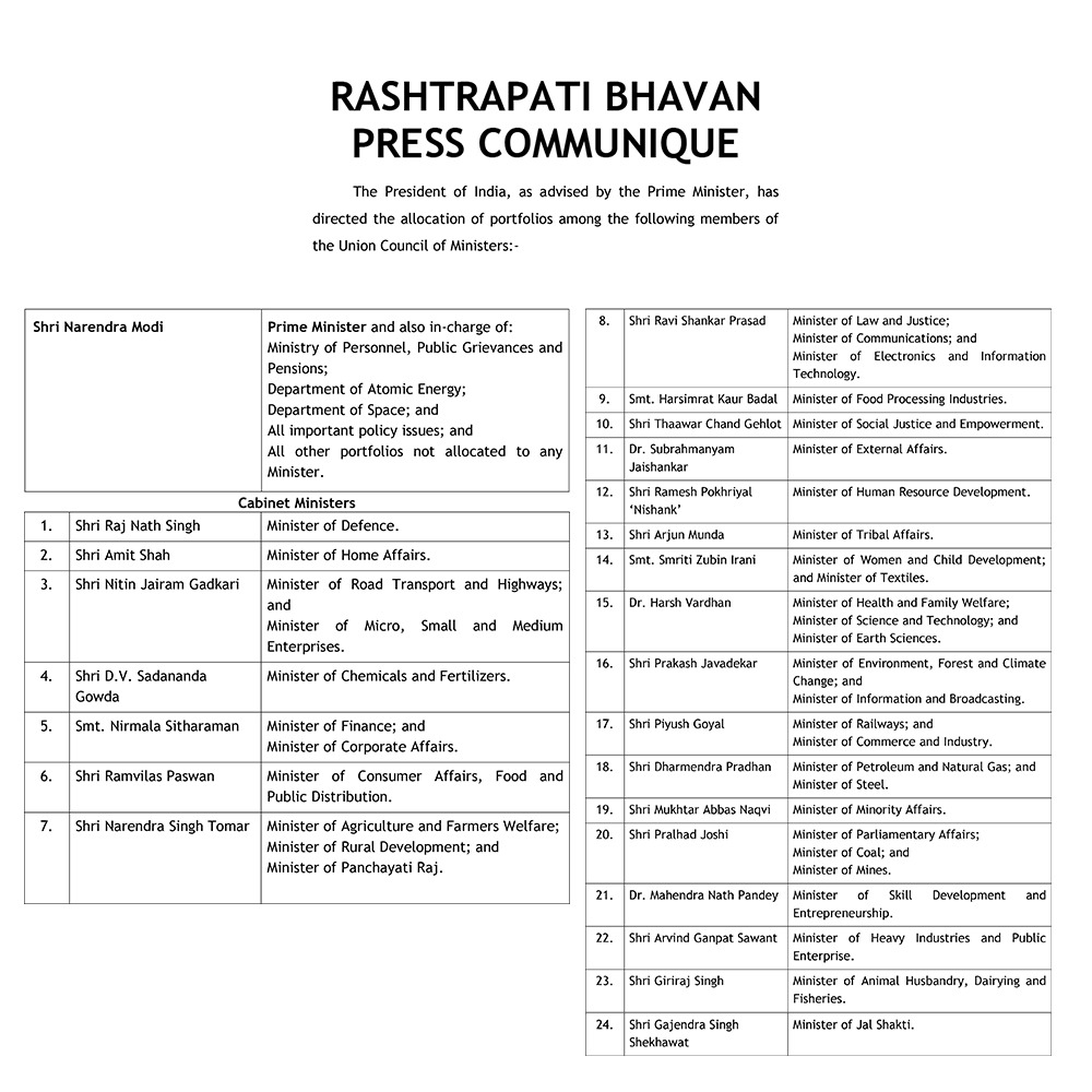 The Prime Minister Narendra Modi led Government, on the 31st of May, allocated portfolios to all the 60 Cabinet Ministers who were sworn in on the 30th of May.