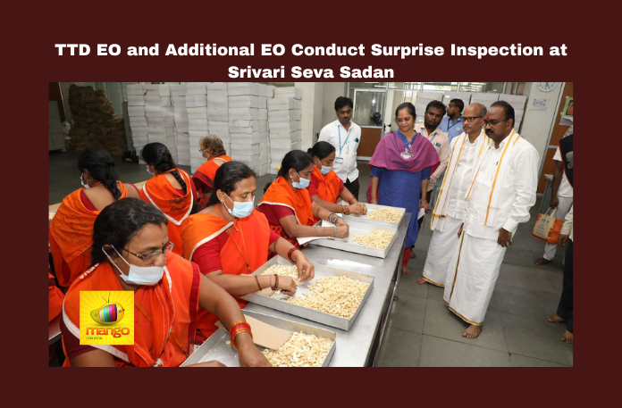 TTD EO and Additional EO Conduct Surprise Inspection at Srivari Seva Sadan, TTD EO and Additional EO Conduct Surprise Inspection, Surprise Inspection at Srivari Seva Sadan, TTD, Srivari Seva Sadan, Surprise Inspection, Tirumala, Executive Officer, Additional EO, Temple Services, Srivari Sevaks, Cashew Splitting Service, Annaprasadam, Facility Improvement, CM Chandrababu Naidu, Pawan Kalyan, AP Live Updates, Live Updates, Breaking News, Headlines, Live News, Mango News