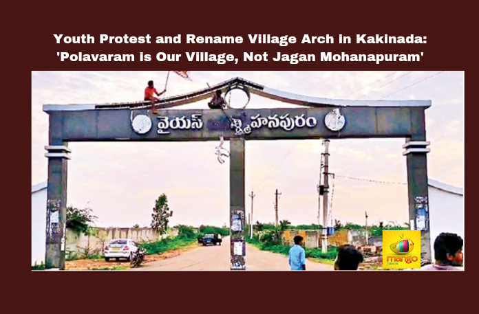 Kakinada: In a bold act of defiance, a group of youths from Polavaram village in Tammavaram Panchayat organized a protest to remove the name ‘Jagan Mohanapuram’ from a large arch at the entrance of their village. The arch, which had been erected on December 25, 2020, bore pictures of former CM YS Jaganmohan Reddy and was part of the YSRCP’s Navaratnalu initiative, promoting houses for the poor.