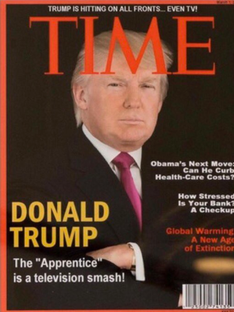 The fake cover portrays a picture of Donald Trump with the headline, “Donald Trump: The ‘Apprentice’ is a television smash!” The magazine cover has another headline above the Time nameplate that reads, “Trump is hitting on all fronts…even TV!”