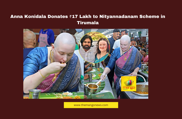 In a heartwarming gesture, Mrs. Konidala visited the Matrushri Tarigonda Vengamamba Nityannadana Satram at 10 a.m. and donated ₹17 lakh to the TTD’s Nityannadanam scheme in the name of her son, Konidala Mark Shankar. The donation was made as a thanksgiving gesture after her son recently recovered from a fire accident in Singapore.