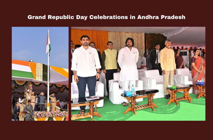 Vijayawada: Republic Day celebrations were held in a grand manner across Andhra Pradesh. Governor Justice Abdul Nazir unfurled the national flag at the Indira Gandhi Municipal Ground in Vijayawada, receiving the ceremonial salute from the police. The event was graced by Chief Minister N. Chandrababu Naidu, Deputy CM Pawan Kalyan, and Minister Nara Lokesh.