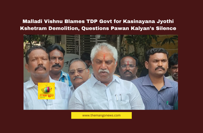 Tadepalli: Former MLA Malladi Vishnu has held the TDP-led coalition government responsible for the demolition of structures at Kasinayana Jyothi Kshetram, a sacred site revered by devotees from Andhra Pradesh, Karnataka, and Maharashtra. Speaking at the YSRCP central office, he condemned the forest department’s large-scale demolition, questioning how such an act could occur under the leadership of Deputy Chief Minister Pawan Kalyan, who claims to protect Sanatana Dharma.