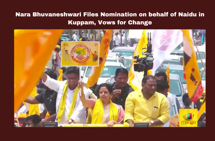 Kuppam: In a significant political move, Nara Bhuvaneshwari, the wife of TDP chief Chandrababu Naidu, filed nomination papers in Kuppam constituency on behalf of her husband. Accompanied by a massive rally of TDP, Janasena, and BJP supporters, Bhuvaneshwari submitted the documents to the Returning Officer (RO) amidst a charged atmosphere.