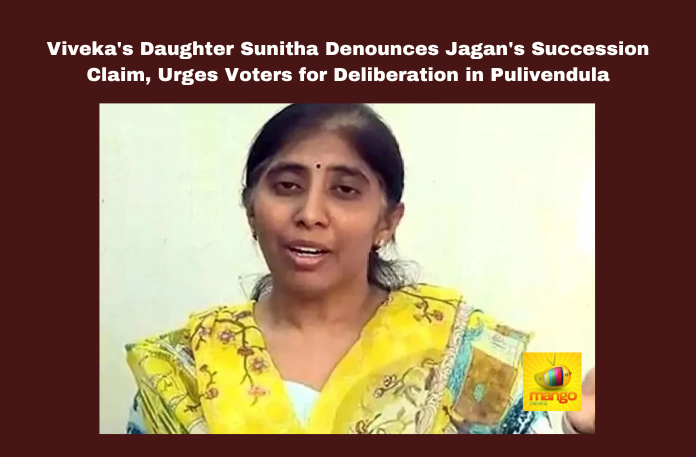 Viveka's Daughter Sunitha Denounces Jagan's Succession Claim Urges Voters for Deliberation in Pulivendula, Urges Voters for Deliberation in Pulivendula, Viveka's Daughter Sunitha Denounces Jagan's Succession Claim, Sunitha Denounces Jagan, Pulivendula, Viveka, Sunitha, Jagan Mohan Reddy, Succession, Election, CBI Investigation, Transparency, Accountability, General Elections, Lok Sabha Elections, Political News, AP Live Updates, Andhra Pradesh, Mango News