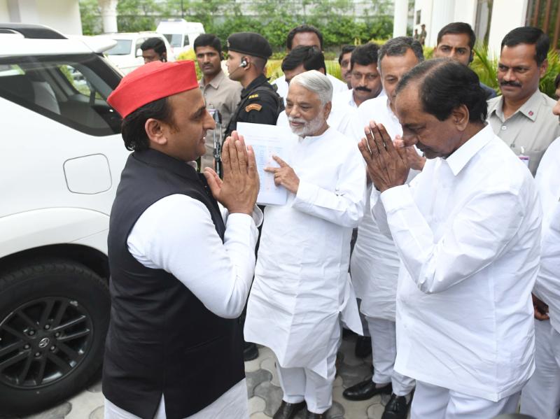 Chief Minister of Telangana K. Chandrasekhar Rao met Samajwadi Party Chief Akhilesh Yadav at Pragathi Bhavan today. The two leaders ate lunch together and then held a joint press conference.