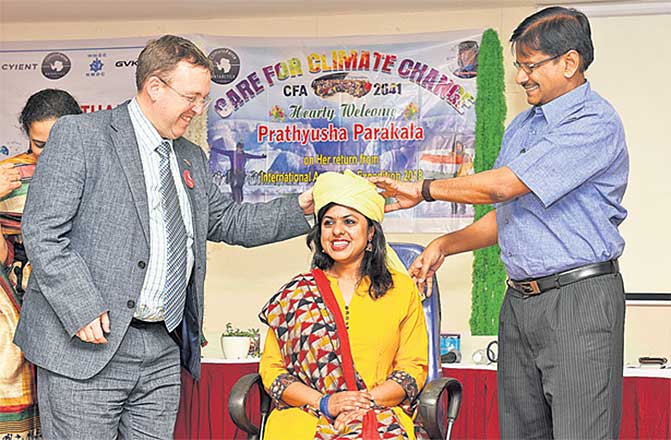Prathyusha Parakala, the only woman from Telangana who completed the expedition to Antarctica was felicitated in Hyderabad on Thursday. Parakala traveled to the Southernmost part of the world with 90 Global Climate Force Ambassadors from 25 countries.