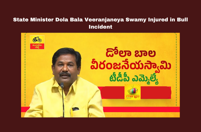 Tanguturu: State Social Welfare Minister Dola Bala Veeranjaneya Swamy suffered a major accident during the Poleramma Kolupu festival in Paletipadu village, Prakasam district, on Sunday. The incident occurred when local leaders and youth competed to take pictures with the minister in front of the decorated bulls. Amidst the festivities, the bulls charged at the minister, pushing him forward and trampling him with their forelegs.