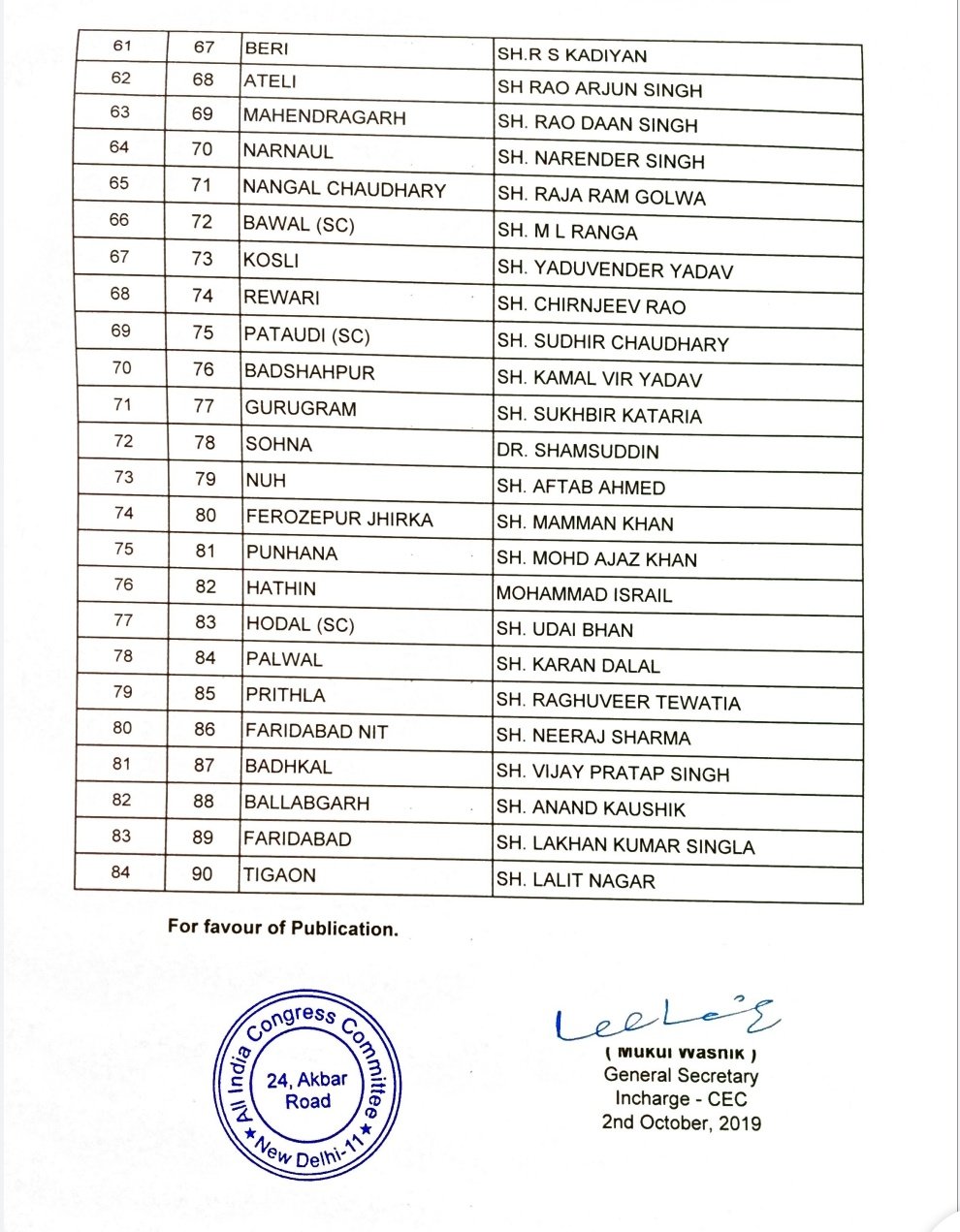 The Party released the list on the night of the 2nd of October, fielding 16 sitting Members of the Legislative Assembly (MLAs) for the Haryana elections.