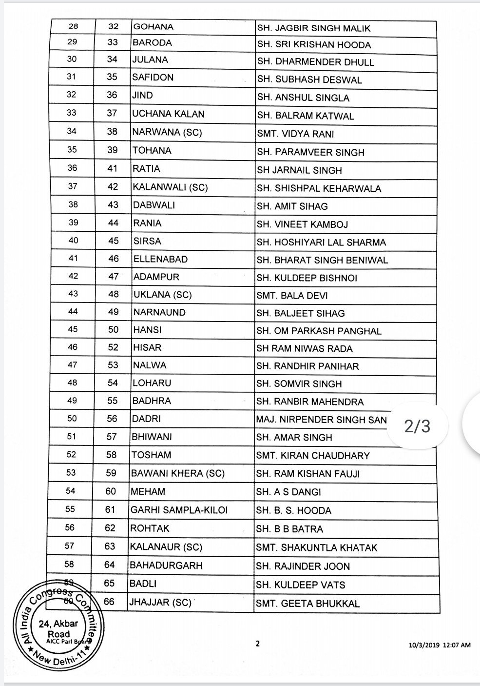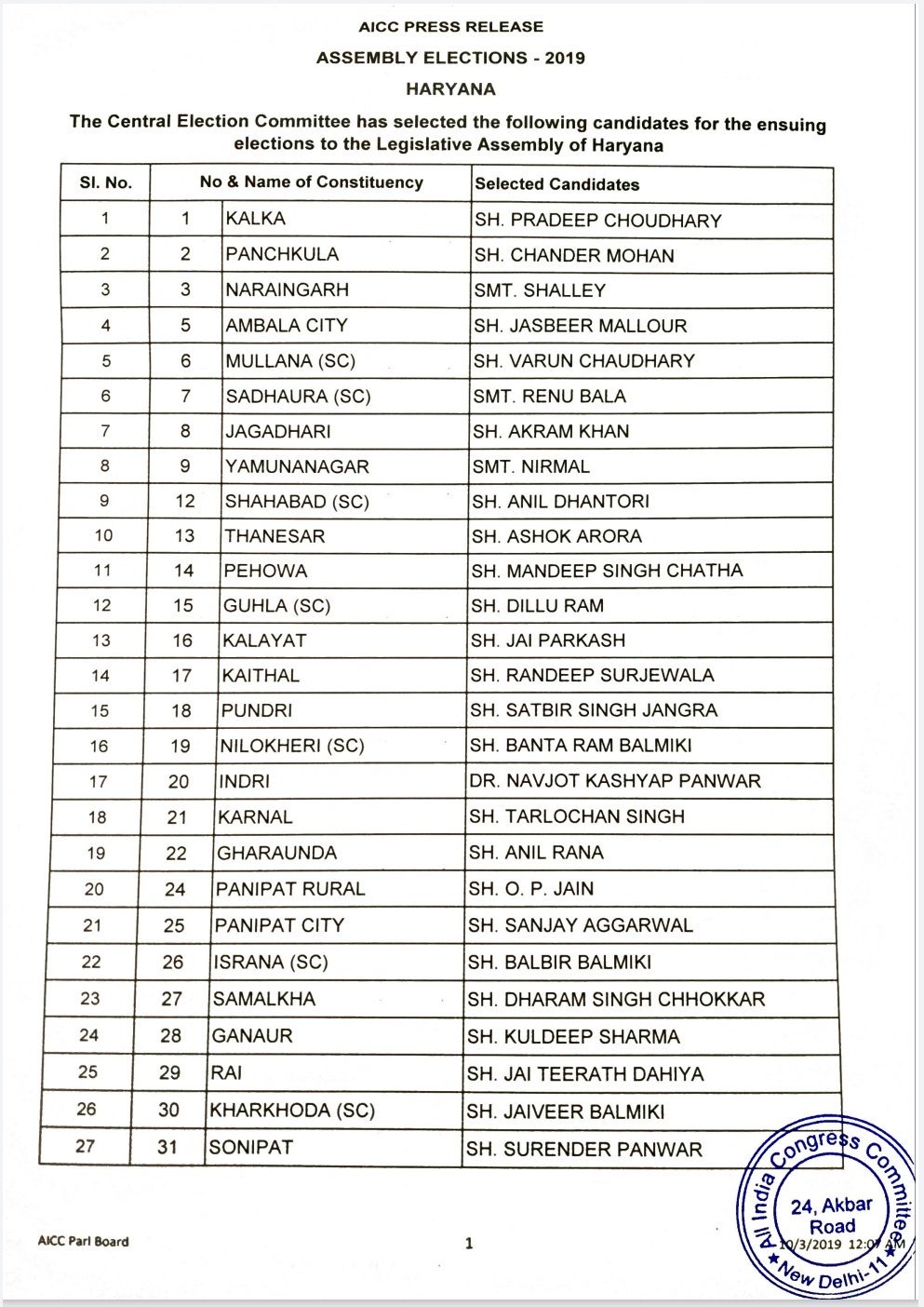 The Party released the list on the night of the 2nd of October, fielding 16 sitting Members of the Legislative Assembly (MLAs) for the Haryana elections.