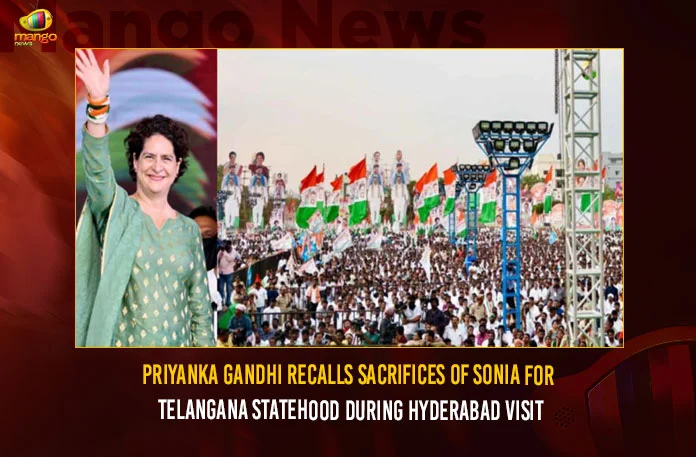 Priyanka Gandhi Recalls Sacrifices Of Sonia For Telangana Statehood During Hyderabad Visit,Priyanka Gandhi Recalls Sacrifices Of Sonia,Telangana Statehood,Priyanka Gandhi Recalls India,Priyanka Gandhi Telangana Visit,Mango News,Priyanka Gandhi At Hyderabad,Priyanka Gandhi The General Secretary Of The AICC Is In Hyderabad,Priyanka Gandhi promises Rs 4000 dole for the jobless,Priyanka promises 2 cr jobs,Priyanka Gandhi Latest News And Updates