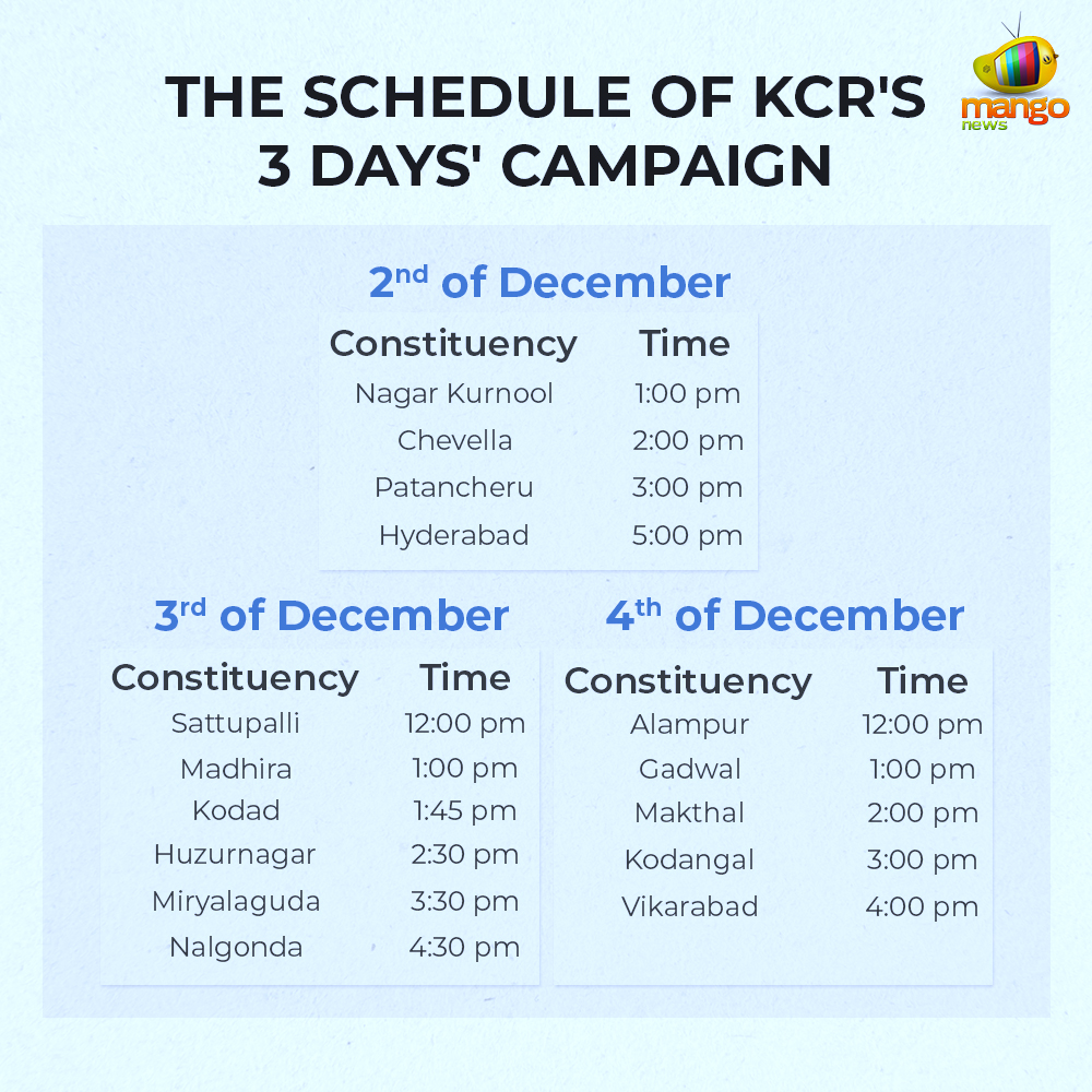 According to the Telangana Rashtra Samithi (TRS) sources, Mr. Rao will prepare for the rest of his campaign on Saturday and resume his campaign from the 2nd of December. He will address public meetings for three consecutive days.