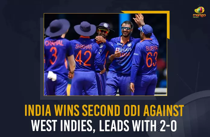 India defeated West Indies by 2 wickets in the Second ODI, India Wins Second ODI Against West Indies Leads With 2-0, India Leads With 2-0 In ODI Series, Team India Wins Second ODI Against West Indies, Ind vs WI ODI Series Team India To Play 2nd Match with West Indies, Team India Eye on The Series, Team India To Play 2nd Match with West Indies Today, Ind vs WI ODI Series, Ind Vs WI 2nd ODI Match, Ind Vs WI, Ind Vs WI 2nd ODI, Ind Vs WI 2nd ODI News, Ind Vs WI 2nd ODI Latest News, Ind Vs WI 2nd ODI Latest Updates, Ind Vs WI 2nd ODI Live Updates, Mango News,