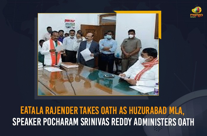 The Assembly speaker Mr. Pocharam Srinivas Reddy administered the oath to the new Huzurabad MLA Mr. Eatala Rajender.   The oath taking ceremony was attended by Mr. Konda Vishweshwar Reddy, Mr. Jithender Reddy, Mr. Enugu Ravinder Reddy and other leaders of the BJP and the State MLAs.