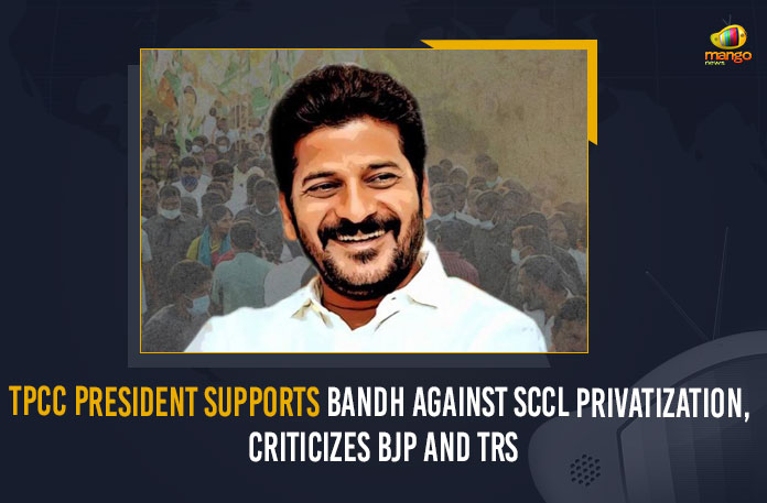 TPCC President Supports Bandh Against SCCL Privatization, Criticizes BJP And TRSMr. A. Revanth Reddy, the President of the Telangana Pradesh Congress Committee (TPCC) supported the bandh called by traders in Telangana.